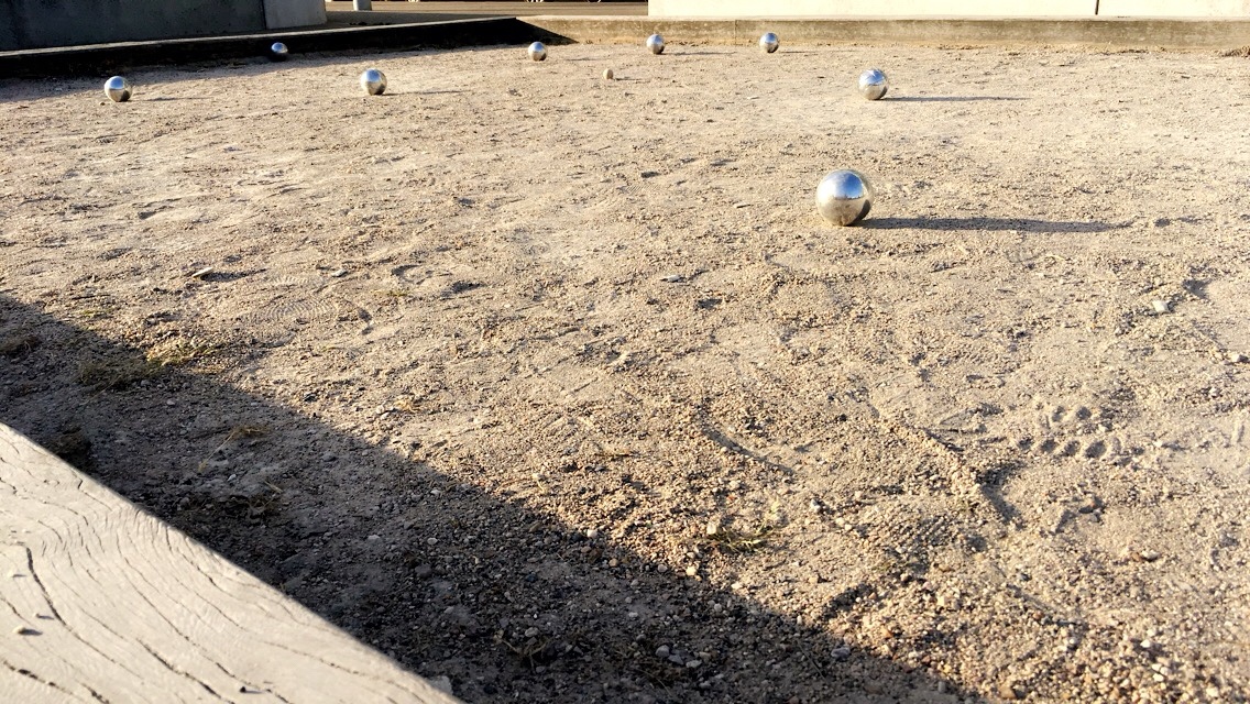 Admittedly, it doesn’t do a whole lot from a calorie-burning/muscle-building perspective. But it is very sociable, owing to the (lack of) pace of the game. If you’re familiar with boules, as I know a lot of British people are anyway, pétanque follows a very similar concept: a little ball (the “cochonnet”, or jack) is cast first and then players throw or roll larger hollow steel balls, aiming to get as close to the jack as possible. There are various other rules involved, but that’s the basic idea. At least in the UK, boules is pretty much exclusively reserved for the beach, but pétanque is played all over the place, with designated “pistes” (dusty/gravelly rectangles for playing pétanque on) available in most (as far as I can see anyway) parks and village squares – especially in the South of France, where the game originated.