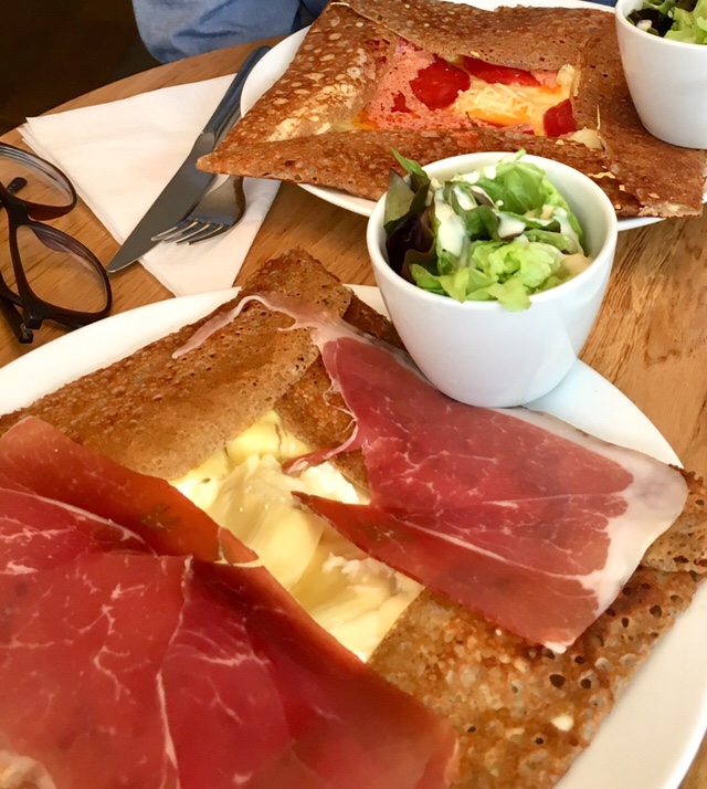 Unlike Chambelland, La Creperie is not a specially-targeted gluten-free establishment. However, their extensive list of galettes (undoubtedly the main attraction of the place) are all naturally gluten-free, as any proper, traditional galette ought to be, since they’re made using buckwheat, which does not contain gluten. I’ve tried two of their galettes now and both have been phenomenally tasty. The café – and it is a café, rather than a restaurant – is bright and tastefully-decorated; the staff are very friendly; and as soon as they get wind of your non-French accent, they will present you with an English menu (much to my disappointment, but very handy if you’re not a French-speaker). Apart from galettes, you can also order their typical accompaniment – Breton cider – which can be bought by the carafe or wine-sized bottle, and sipped from small bowls, in the traditional fashion. Unfortunately, the sweet crêpes are not gluten-free, but to be honest, you’ll be so stuffed from the generously-stuffed galettes that dessert is highly unlikely to seem an appealing prospect anyway.**
