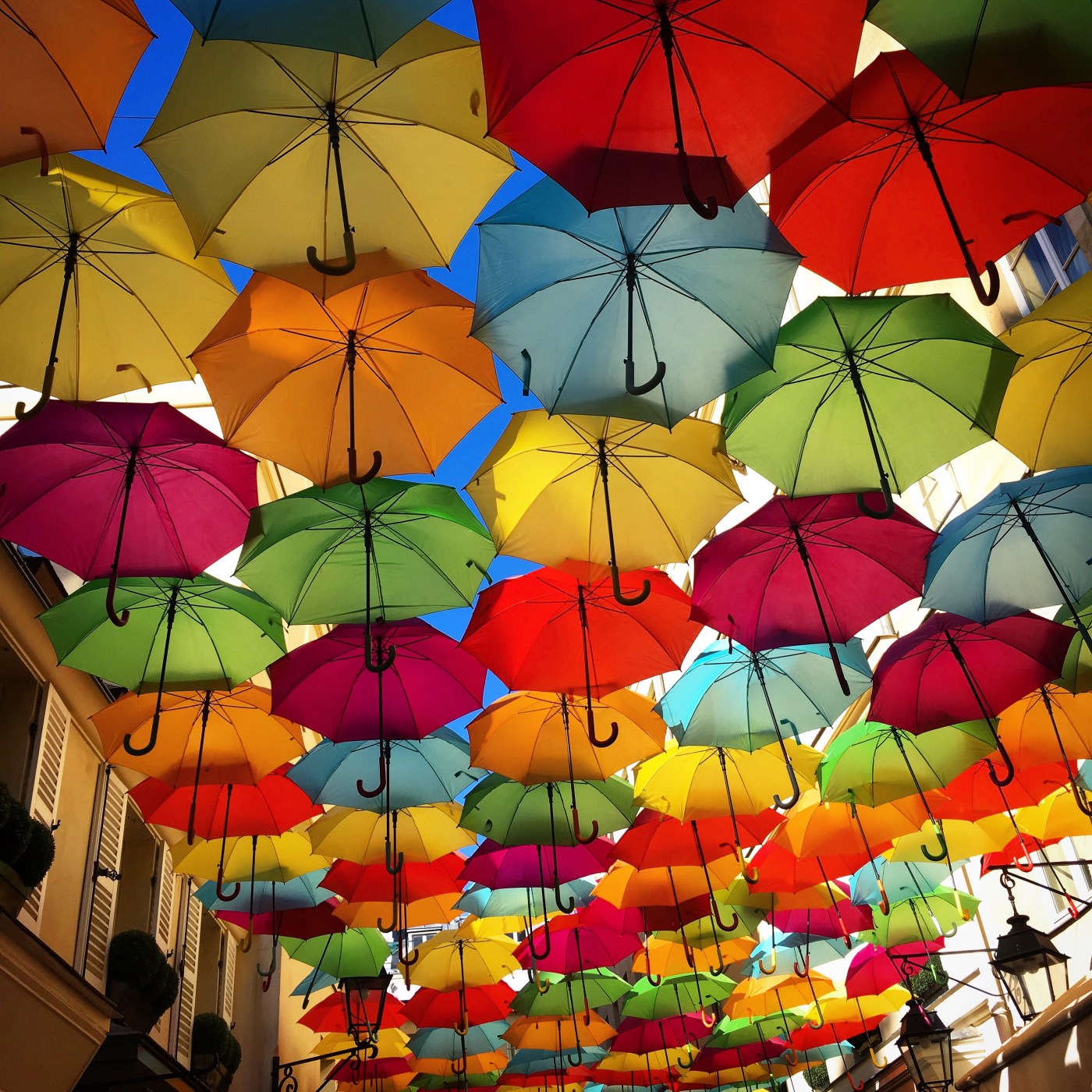 I happened across the most fabulously random little gem whilst walking through the 8th arrondissement this morning: a side street with a ‘ceiling’ of suspended umbrellas. Real ones.